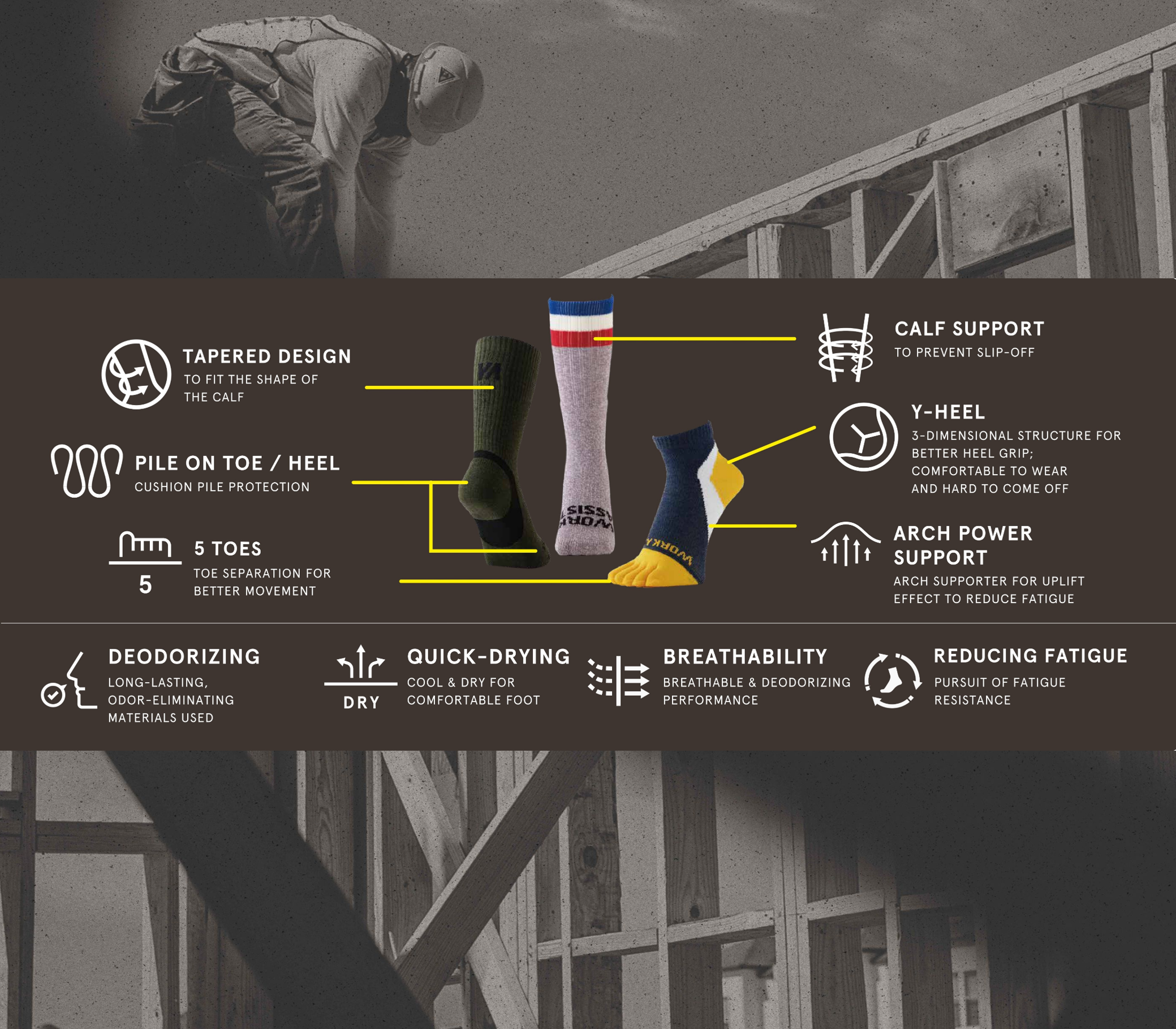 Read moreAs a type of knitted fabrics, socks generally have structures with excellent breathability. By using carefully selected materials, WORK ASSIST achieves even better breathability.
